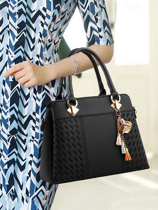 Women’s Faux Leather Handbag with Tassel Charm and Textured