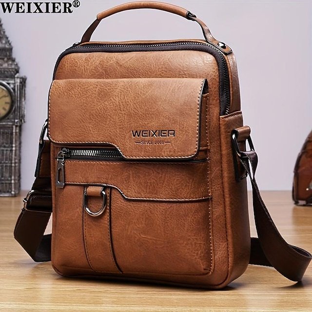 Gender: Men’s, Type: Messenger Bag, Material: PU Leather, Embellishment: Zipper, Pattern: Solid Color, Occasion: Daily, Office, Width (cm): 8, Height (cm): 26, Length (cm): 22, Function: Waterproof, Large Capacity, Durable, Category: Shoulder Bag,