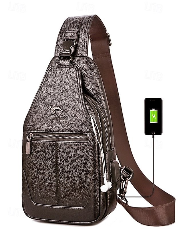 Men’s Faux Leather Sling Chest Bag with USB Charging Port,